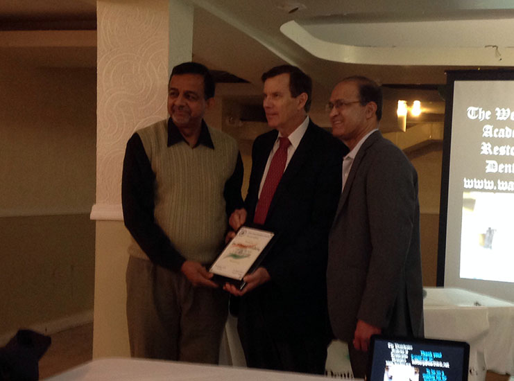 Dr. Feinberg Receiving his Certificate of Appreciation with Dr. Amrish Parikh, President 2nd District Society [Left] and Dr. Sudhakar Shetty, President IDA USA) [Right].